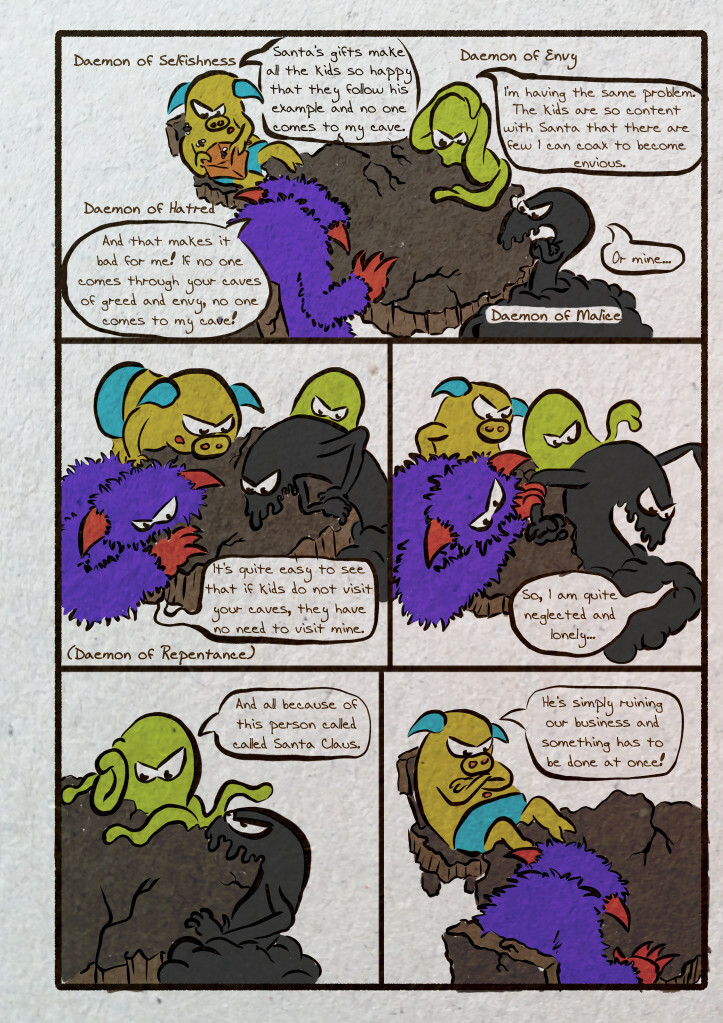 Deep in the huge mountain the daemons conjure a devious plan to ruin Christmas and trick more children in to their caves.